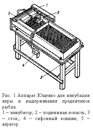 Аппарат Ющенко образца 1959г. применяется для инкубации икры и выдерживания предличинок рыбца. Основные части аппарата - инкубатор, подвижная лопасть, сифонный ковшик, фильтр аэратора и стол (рис 1).