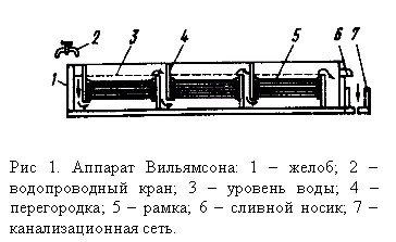 Вода поступает в аппарат сверху у одной торцовой стенки, а сбрасывается снизу через трубку, регулирующую горизонт воды, у другой торцовой стенки. В 15 см от каждой торцовой стенки, где подается и сбрасывается вода, вертикально поставлена защитная сетчатая рамка (перегородка). Сетка этих рамок с размером ячеи 2 мм. Аппараты часто делают спаренными и устанавливают в лестничном порядке, стыкуя их по два в ряд. Расход воды в двух аппаратах равен 3,5-9,5 л/мин.