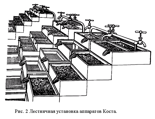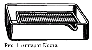 Аппарат Коста представляет собой ящик размером 50х20х10 см, изготовленный из листового железа (рис. 1). На внутренних сторонах ящика примерно в 5 см от дна имеются выступы, на которые кладется деревянная рамка, обтянутая металлической тканой сеткой типа "Трепсе". Размер ячеи сетки 18х3,5 мм. Аппарат покрыт асфальтовым лаком. На рамку в один слой кладут 2-2,5 тыс. икринок лосося. Вода подается у одного края аппарата, затем она протекает над рамкой с икринками и сбрасывается через носик, расположенный с противоположного края. Расход воды-0,6 л/мин. Вылупившиеся предличинки проваливаются через сетчатую рамку и падают на дно аппарата. В целях экономии воды, площади аппараты Коста устанавливают на подставках в лестничном порядке в несколько групп.