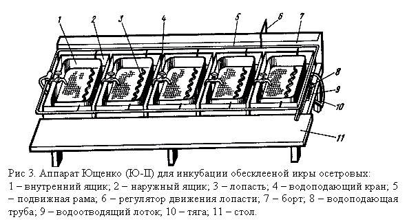 Инкубатор состоит из металлической ванны размером 140 x50х15 см и вставленного в нее металлического вкладыша размером 120х45х10 см с сетчатым дном с ячеей размером 1- 1,1 мм Вкладыш разделен выдвижной перегородкой на две части меньшую инкубационную часть и большую для выклева свободных эмбрионов. В инкубационную часть аппарата помещают 300 тыс. обесклееиных икринок рыбца.