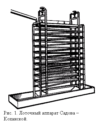 Лоточный аппарат Садова-Коханской применяют для инкубации необесклеенной икры осетровых. Этот аппарат состоит из металлической рамы размером 150х38х180 см, внутри которой закреплены дюралюминиевые уголки (2х5х150 см) (рис. 1). На уголки устанавливаются лотки, изготовленные из пластмассы (например, из ударопрочного полистерола). Длина лотка-140 см, ширина-36 см, высота бортиков-2 см. В одном аппарате размещается 21 лоток. Эти лотки загружают икрой.