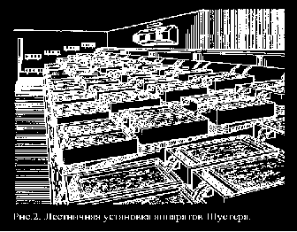 В него закладывают на инкубацию 20-24 тыс. икринок лосося. Обычно аппараты Шустера, как и аппараты Коста, устанавливают в лестничном порядке группами, в каждую из которых входят не более 5 аппаратов (рис. 2). При расходе воды 2-3 л/мин икра во всех 5 аппаратах обеспечивается необходимым количеством кислорода.