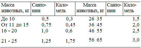 Сантонин назначают в дозе 0,05 г/кг с каломелем (0,03 г/кг) после предварительной 12-часовой голодной диеты