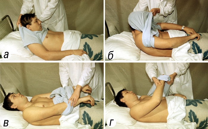 Следует правильно подкладывать судно (больные должны опереться и приподняться благодаря здоровой ноге и локтям).