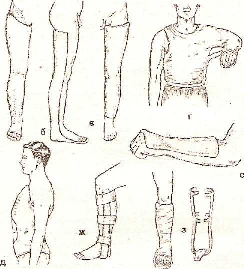 а) – циркулярная; б) – съемная лангета-кроватка; в) – тутор; г) – повязка на грудь и руку с распоркой; д.) – корсет; е) – тыльная лонгета; ж) – шина с тремя кольцами по Ситенко; з) – повязка со стременем.