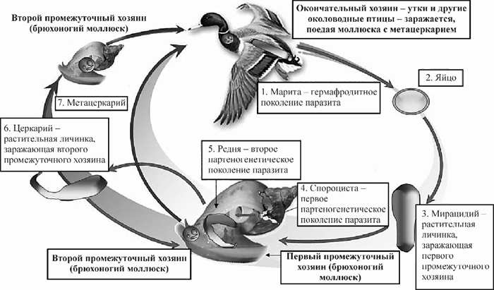 проникновение и инцистирование в промежуточном хозяине (стадия метацеркарии), при этом промежуточный хозяин служит пищей для окончательного хозяина или следующего промежуточного хозяина (встраивание в трофическую цепь);