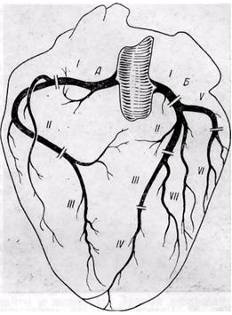 Кровоснабжение сердца осуществляется по двум основным сосудам правой и левой коронарным артериям, начинающимся от аорты тотчас выше полулунных клапанов. Левая коронарная артерия начинается из левого заднего синуса Вальсальвы, направляется вниз к передней продольной борозде, оставляя справа от себя легочную артерию, а слева - левое предсердие и окруженное жировой тканью ушко, которое обычно ее прикрывает. Она представляет собой широкий, но короткий ствол длиной обычно не более 10-11 мм. Левая коронарная артерия разделяется на две, три, в редких случаях на четыре артерии, из которых наибольшее значение для патологии имеют передняя нисходящая и огибающая ветви, или артерии.