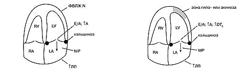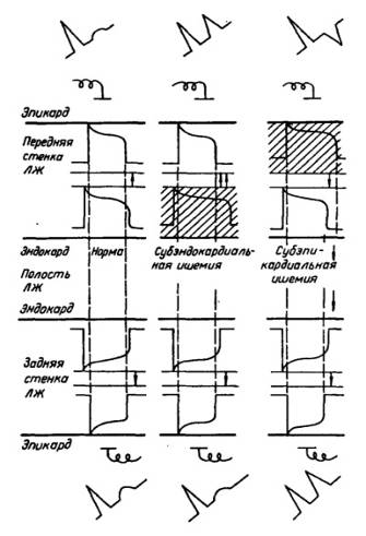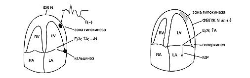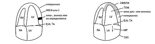 Собственно ультразвуковыми маркерами ишемии являются: а) локальные нарушения кинетики миокарда ЛЖ (акинез, гипокинез, дискинез, аневризма-тическое выбухание стенки); б) ремоделирование ЛЖ (дилатация полостей, изменение формы ЛЖ, уменьшение скорости циркулярного укорочения волокон миокарда); в) уменьшение скорости и изменение фазовых характеристик потока крови в аорте и через митральный клапан при различных видах допплеровской регистрации потока крови.