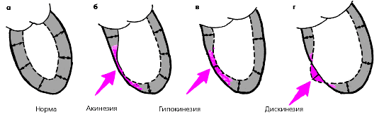 Было показано, что при транзиторной регионарной ишемии наибольшую чувствительность, специфичность, клиническую значимость и диагностические возможности имеют эхокардиографические показатели регионарной асинергии миокарда ЛЖ. В обычной клинической практике оценка стресс-ЭхоКГ также проводится преимущественно на основе анализа регионарной сократимости миокарда ЛЖ сердца. Анализ кинетики стенок миокарда является основным предметом стресс-ЭхоКГ-исследования.