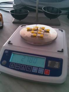 Для определения средней массы взвесили вместе 10 невскрытых капсул и определили среднюю массу капсулы. Затем взвесили каждую капсулу отдельно и сравнили со средней массой капсулы. Отклонение массы каждой капсулы не должно превышать ±10 % от средней массы. Затем осторожно вскрыли те же 10 капсул, удалили как можно полнее содержимое и взвесили каждую оболочку. Если нет других указаний в частных статьях, отклонение массы содержимого каждой капсулы от средней массы не должно превышать ±10 % [4] Табл.2