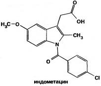 Также среди производных индола один из первых нестероидных противовоспалительных препаратов – индометацин, созданный в 70-х гг. В последующем на его основе были созданы менее токсичные лекарственные вещества аналогичного действия, производные фенилуксусной, фенилпропионовой и других кислот (ибупрофен, ортофен, пироксикам и др.).