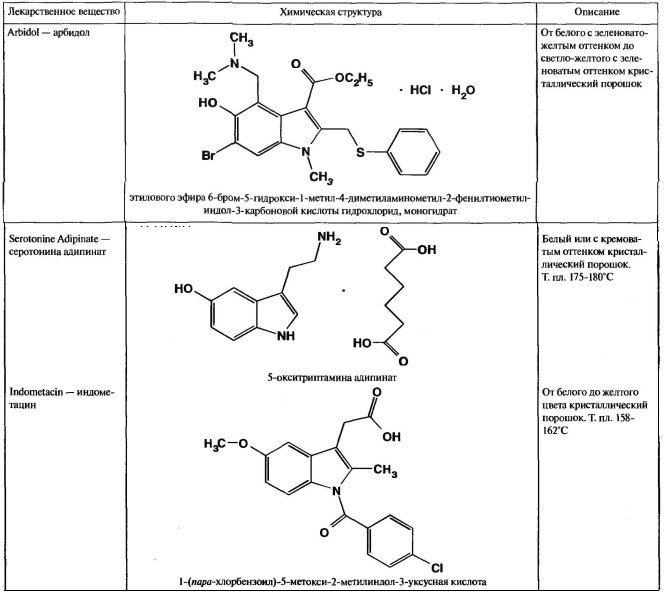 Триптофан и индометацин представляют собой органические кислоты, остальные являются солями органических оснований. Молекулы производных индолалкиламинов включают алифатические радикалы, содержащие атомы серы или сложноэфирные группы.