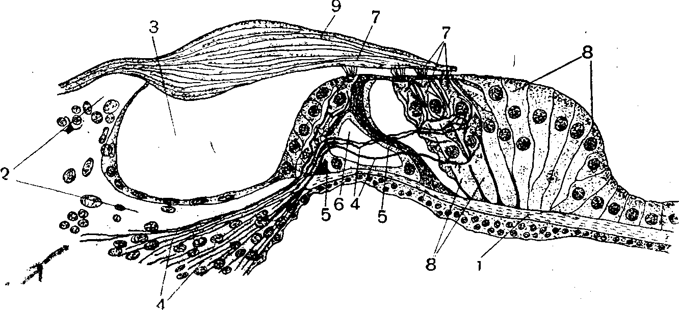 Мал. 4. Схема будови кортиєвого органу: 1 — основна пластинка; 2 — кісткова спіральна пластинка; 3 — спіральний канал; 4 — нервові волокна; 5 — стовпові клітки, створюючі тунель (6); 7 — слухові, або волосковые, клітки; 8 — опорні клітки; 9 — покривна пластинка.