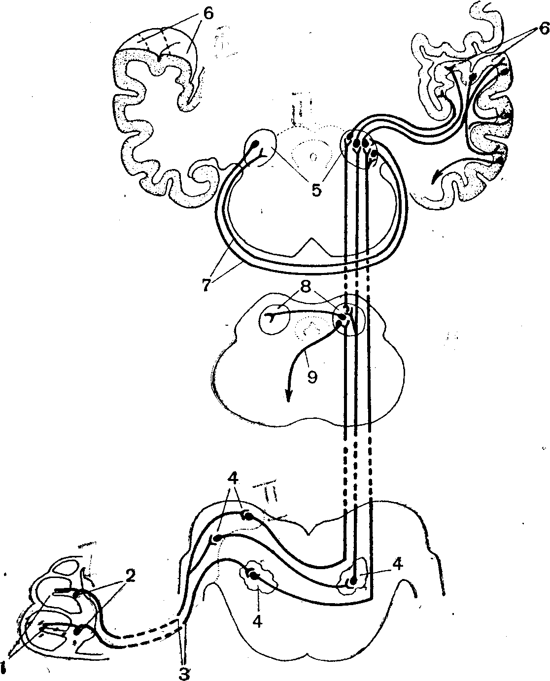 Мал. 5. Схема провідних шляхів слухового аналізатора: 1 — рецептори кортиєвого органу; 2 — тіла біполярних нейронів; 3 — нерв равлика; 4 — ядра довгастого мозку, де розташовані тіла другого нейрона провідних шляхів; 5 — внутрішнє колінчасте тіло, де починається третій нейрон основних провідних шляхів; 6 - верхня поверхня скроневої частки кори великих півкуль (нижня стінка поперечної щілини), де закінчується третій нейрон; 7 — нервові волокна, що зв'язують обидва внутрішні колінчасті тіла; 8 — задні горби четверохолмія; 9 — початок еферентних шляхів, що йдуть від четверопагорбу.