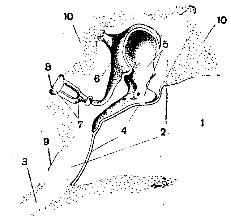 Мал. 1. Напівсхематичне зображення середнього вуха: 1— зовнішній слуховий прохід, 2— барабанна порожнина; 3 — слухова труба; 4 — барабанна перетинка; 5 — молоточок; 6 — ковадло; 7 — стремено; 8 — вікно переддня (овальне); 9 — вікно равлика (кругле); 10— кісткова тканина.