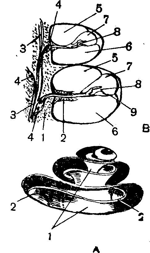 Мал. 3. Схематичне зображення равлика внутрішнього вуха: А — кістковий канал равлика; У — схема поперечного розрізу частини равлика;1 — кістковий стрижень; 2 — спіральна кісткова пластинка; 3 — волокна нерва равлика; 4 — скупчення тіл першого нейрона слухового провідного шляху; 5 — сходи переддя; 6—сходи барабана; 7— частина равлика перетинкового лабіринту; 8 — кортіїв орган; 9 — основна пластинка.