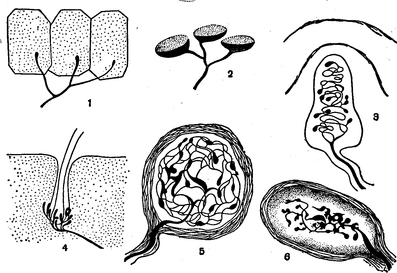 Мал. 1. Напівсхематичне зображення деяких рецепторних апаратів шкіри: 1 — вільні нервові закінчення в епідермісі; 2 — дотикові тільця Меркеля (головним чином в епідермісі); 3 — дотикове тільце Мейсснера; 4 — нервове сплетення навколо волосяної цибулини; 5 — чутливе до холоду тільце (або колба) Краузе; 6 — фатерпачинне тільце, чутливе до тиску.