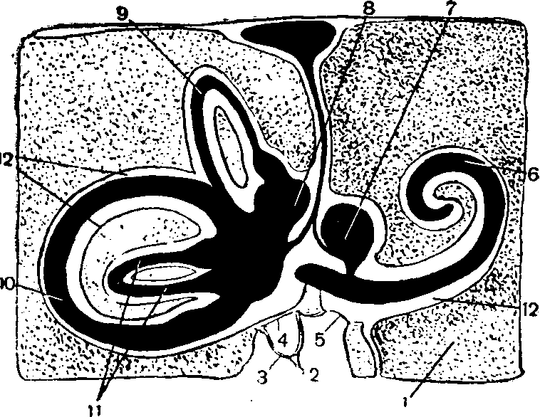 Мал. 2. Загальна схема кісткового перетинкового лабіринту: 1 – кістка; 2 – порожнина середнього вуха; 3 — стремя; 4 — вікно переддя; 5— вікна равлика; 6 — равлик; 7 і 8 — отолітовий апарат (7 — саккулус або круглий мішочок; 8 — утрикулус, або овальний мішочок); 9, 10 і 11 — півкруглі канали 12 — простір між кістковим і перетин-ковим лабіринтами, заповнений перилімфою.
