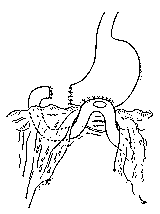 Для мобилизации малой кривизны по задней стенке желудка проводят указательный палец к малому сальнику и, тупо проделав в нем отверстие на уровне антрального отдела желудка, оттягивают желудок влево и вниз. Рассекают бессосудистую часть малого сальника (lig. hepatogastricum); накладывают на а. gastrica dextra, а затем на а. gastrica sinistra две прочные лигатуры и между ними сосуды пересекают. Наложение лигатуры на центральный отрезок левой желудочной артерии является наиболее ответственным моментом в процессе мобилизации желудка (накладывают двойную лигатуру) и может быть произведено на следующих этапах операции.