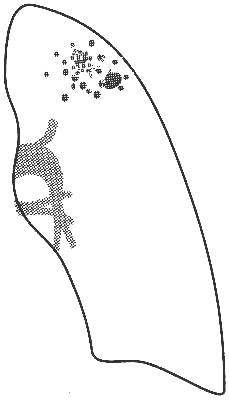 В рентгенологическом изображении свежие очаги имеют сравнительно небольшие размеры (1–1,5 см), округлую, овоидную, грушевидную или розеткообразную форму, низкую интенсивность, однородную структуру, более или менее четкие контуры. Размеры очагов, как правило, не превышают размеров дольки легкого. Мелкие очаги диаметром 3–4 мм чаще имеют продуктивно-фиброзный характер, крупные очаги отражают экссудативно-казеозный тип реакции. Изменения локализуются преимущественно в верхушечно-задних сегментах легких.