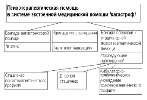 Антисрессовая специализированная медицинская помощь в условиях ЧС осуществляется на основе этапной системы организации лечебных мероприятий: догоспитальный, госпитальный этапы и последующее наблюдение в специализированных амбулаторно-поликлинических ЛПУ психотерапевтического и психиатрического профиля.