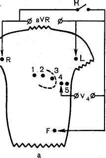 Пунктирна лінія — частина контуру серця. Ключ До замикається при вимірі ЕКГ у відведенні V>4>; а, б — вид попереду і збоку (відповідно).