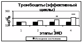 Рис. 1. Количество тромбоцитов в эффективных и неэффективных циклах. Здесь и на рис. 2-6 1- стимуляция суперовуляции, 2- день введения хорионического гонадотропина, 3- день переноса эмбриона в полость матки, 4- 14–ый день после переноса эмбриона. Достоверность отличий: