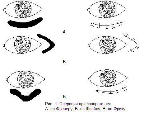 При завороте век хорошие результаты дают операции по Френеру, Фрику, Шлейху (рис 1). Отступив 5 мм от наружного угла глаза, делают параллельно краям век разрезы кожи, сходящиеся под острым углом. От внутренних концов этих разрезов проводят два новых разреза, точка пересечения которых должна находиться снаружи от первых разрезов. Кожу, ограниченную разрезами, захватывают пинцетом и отпрепаровывают.