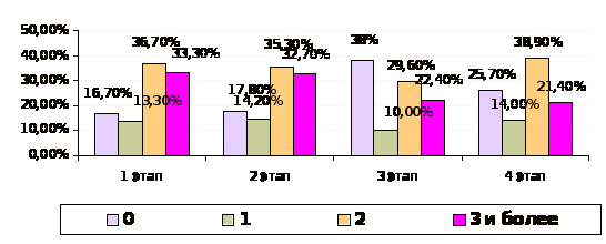 Значимым показателем эффективности выступала частота госпитализаций по основному и сопутствующим заболеваниям. За исследуемый период он значительно уменьшился. Если при первичном опросе - 2 раза в год госпитализировалось 6,6 %, то после курса реабилитации на 3 этапе - 3,2% опрошенных. На первом этапе 1 раз в год были госпитализированы 36,7%, на 3 этапе - 13,3 %. При первичном опросе у 56.7% пациентов не было ни одной госпитализации, после курса реабилитации данный показатель увеличился до 83,5% на третьем этапе. Причем на втором этапе, как и у вышеприведенного показателя, существенных изменений не отмечалось. На 4 этапе 1 раз в год были госпитализированы 19,9%; 2 раза в год – 5%; снизился процент пациентов на 8,4% кто не госпитализировался за весь год и составил 75,1% по сравнению с 3 этапом за период наблюдения (Рис.5).