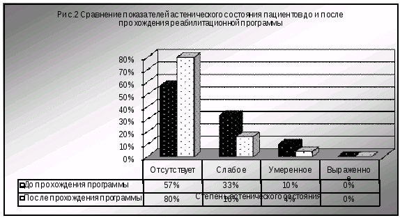 Значительные изменения по астеническим показателям так же говорит о возросших адаптационных потенциальных возможностях пациентов. Пациенты начинают уделять особое внимание потенциалам здоровья, потенциалам тела (физический аспект здоровья), креативным потенциалам, потенциалам разума.
