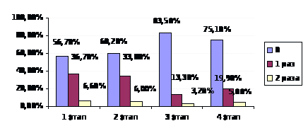 Как видно на рис.1. ни разу не проходивших амбулаторное лечение на 4 этапе составило- 25,7%; 1 раз в год - 14,0%; дважды в год получили уже 38,9%; 3 и более раза - 21,4% пациентов. Кроме того, было отмечено увеличение вызовов на дом врача и скорой медицинской помощи.