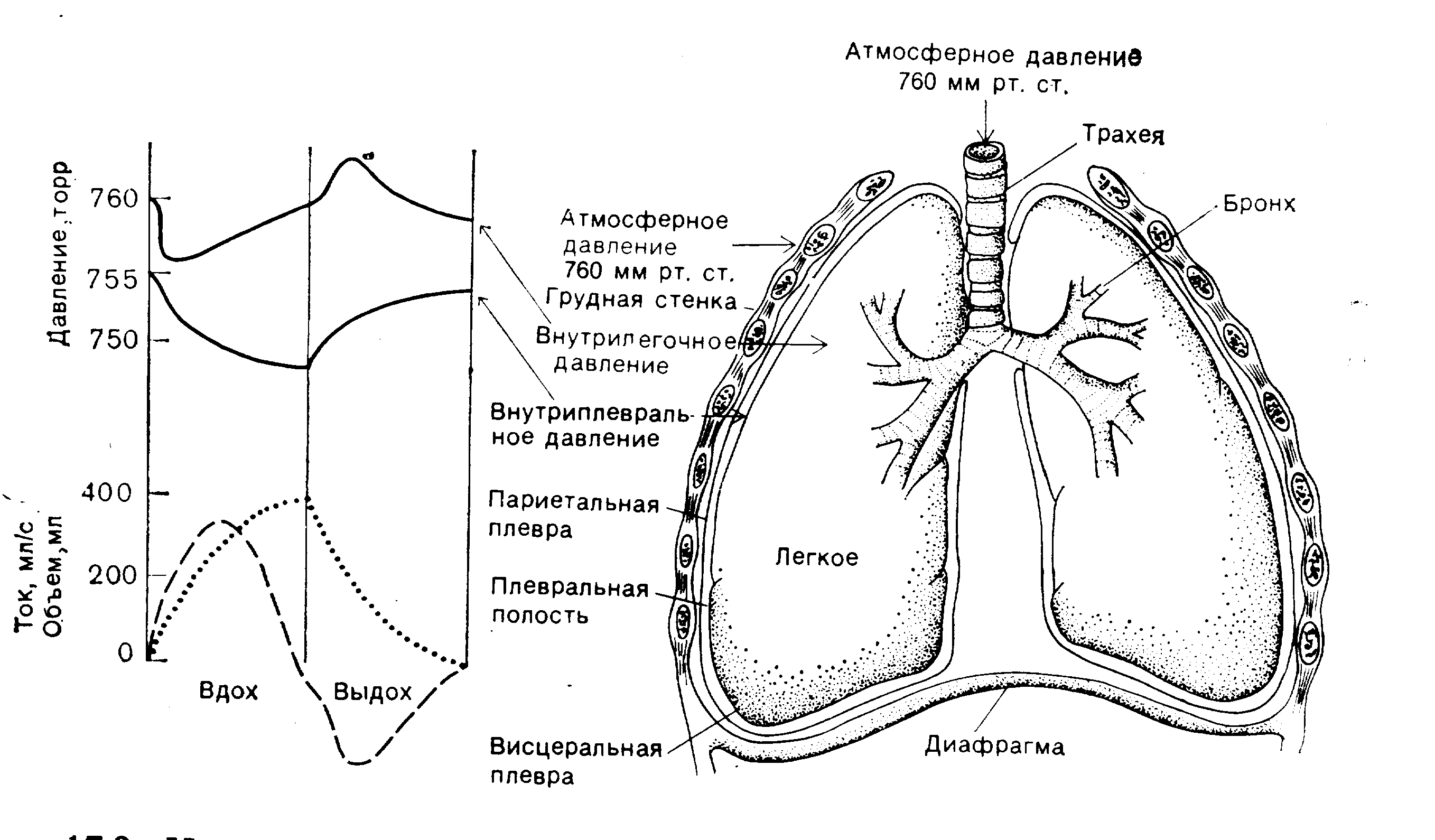 Расширение легкого снижает (на время) общее внутрилегочное (альвеолярное) давление. Оно равно атмосферному, когда воздух не движется, а голосовая щель открыта. Оно ниже атмосферного, пока легкие не наполнятся при вдохе, и выше атмосферного при выдохе. Внутриплевральное давление тоже меняется на протяжении дыхательного движения; но оно всегда ниже атмосферного (т. е. всегда отрицательное).