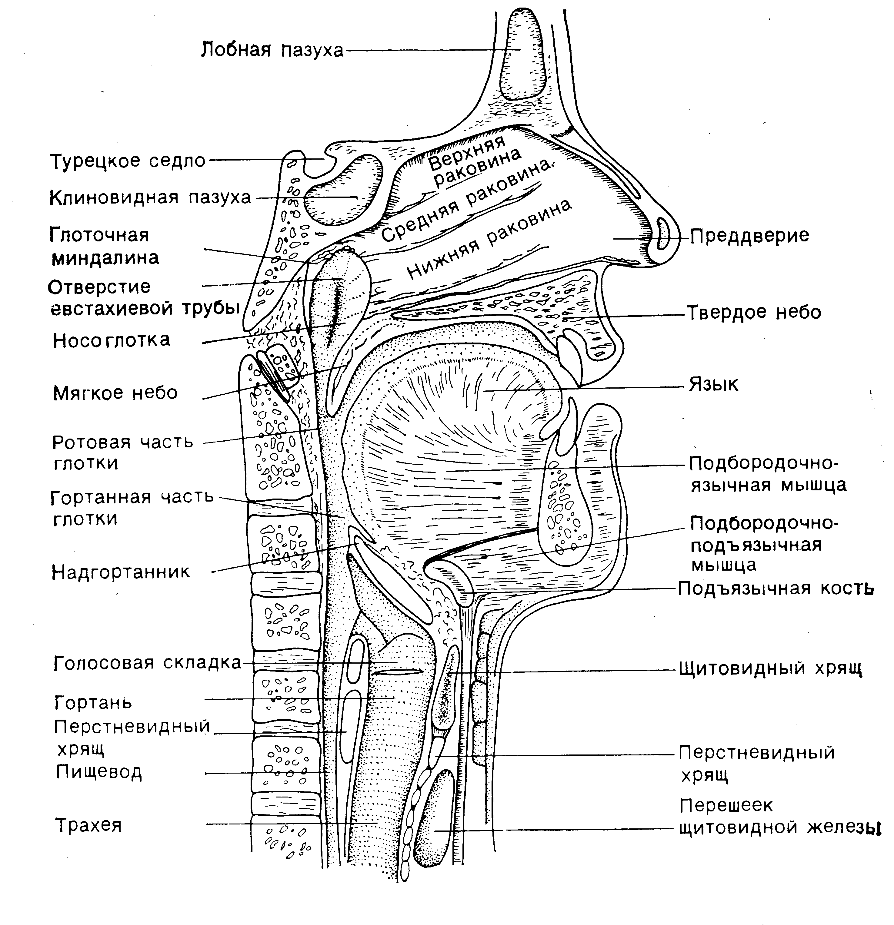 Гортань лежит между трахеей и корнем языка. Полость гортани разделена двумя складками слизистой оболочки, не полностью сходящимися по средней линии. Пространство между этими складками - голосовая щель защищено пластинкой волокнистого хряща - надгортанником (рис. 2 ). По краям голосовой щели в слизистой оболочке лежат фиброзные эластичные связки, которые называются нижними, или истинными, голосовыми складками (связками). Над ними находятся ложные голосовые складки, которые защищают истинные голосовые складки и сохраняют их влажными; они помогают также задерживать дыхание, а при глотании препятствуют попаданию пищи в гортань. (рис. 1 )