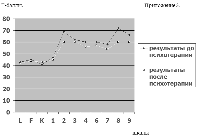 Результаты по методике MMPI до и после психотерапии у больных ишемической болезнью сердца.