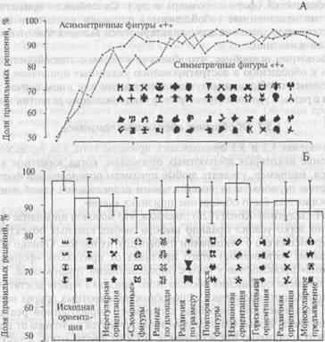Всего в процессе обучения было использовано по 26 стимулов, обладающих и не обладающих свойством симметрии. Поскольку их второстепенные характеристики постоянно менялись, можно считать, что подкреплялся выбор «отвлеченного» признака. Стимулы обоих типов предъявляли по одному и чередовали в квазислучайном порядке, так чтобы предотвратить выработку реакции на посторонние признаки. Птицам потребовалось относительно небольшое число сочетаний, чтобы научиться узнавать наличие (или отсутствие) симметрии, и они успешно выполнили тест на перенос даже при предъявлении новых, по-разному ориентированных и преобразованных стимулов (рис. 4Б). (Квазислучайным называют такую последовательность предъявления стимулов, когда из ряда случайных чисел выбирают отрезки, так называмые серии Геллермана, удовлетворяющие определенным требованиям. В этих последовательностях не должно быть более 3 повторов одного стимула и должно быть приблизительно равное число положитительных и отрицательных стимулов).