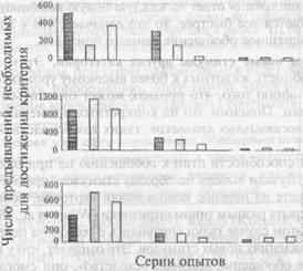 Число сочетаний, необходимое для достижения выбранного критерия правильных выборов новых стимулов после теста на перенос, может быть показателем достигнутого животным уровня обобщения. Чем меньше эта величина, тем ближе животное к формированию обобщения по данному признаку (рис. 2).