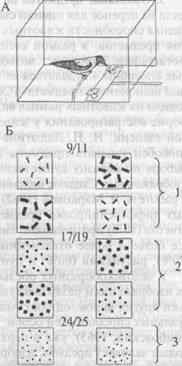 Такими картонными карточками накрывали две одинаковые кормушки, расположенные в 15 см друг от друга (рис. ЗА). Элементами множеств (в интервале от 1 до 12) служили небольшие кружки, прямоугольники, треугольники и др. Если птица сбрасывала карточку с изображением большего числа элементов, она находила в кормушке подкрепление — личинок мучного хрущака. Оба стимула предъявляли одновременно, так что выбор был альтернативным. Обучение проводили в режиме систематического варьирования второстепенных параметров стимулов, т.е. последовательно чередовали 40 комбинаций множеств в диапазоне от 1 до 12.