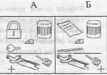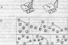 Рис. 1. Схема экспериментов с птицами методом выбора по образцу. А — альтернативный выбор; Б — множественный выбор по признаку «число элементов». Стрелкой отмечен стимул, соответствующий образцу (по О. Келеру).