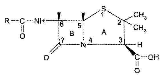 В основе строения пенициллинов лежит 6-АПК, которая представляет собой гетероциклическую систему, состоящую из 2 конденсированных колец: четырехчленного - β-лактамного (В) и пятичленного — тиазолидинового (А) (рис. 2). 6-AПК является дипептидом, состоящим из L-цистеина и L-валина.