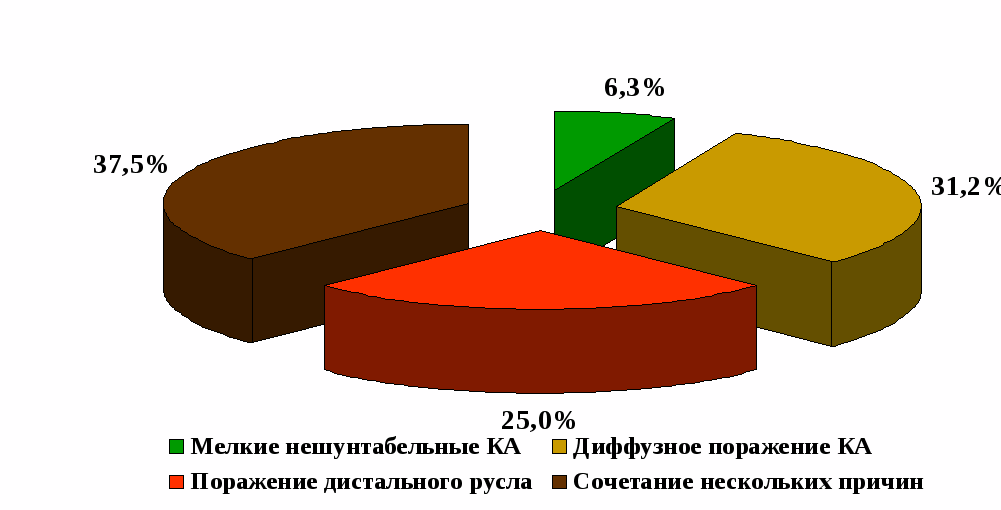 Как известно, наличие поражений в дистальных сегментах коронарных артерий не влияет на непосредственные результаты АКШ. Однако, в отдаленные сроки наличие дистальных сужений и диффузного поражения русла коронарных артерий существенно увеличивает число осложнений, количество случаев с возвратом стенокардии, заметно укорачивает сроки эффективного функционирования шунтов и, нередко, заканчивается фатально [94, 122, 168]. Как указывают H. Schaff и соавт. [171] наличие нешунтабельных коронарных артерий является наиболее значительным прогностическим признаком отдаленных осложнений и летальности после АКШ.