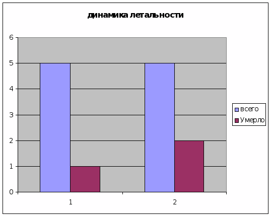 Установлено, что летальность в первой группе составила 1 (20%), во второй группе летальность составила 2 человек (40%).