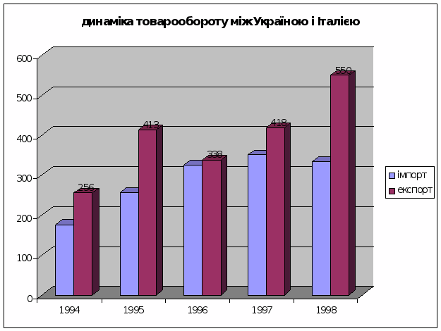 Дані графіку 1 свідчать, що негативне сальдо України у торгівлі з ЄС постійно зростало впродовж 1994 - 1997 років, зменшившись лише 1998 року порівняно з 1997 р. на 600 млн дол. Зменшення торго-вельного дефіциту 1998 р. стало і наслідком фінансової кризи в Україні, що призвела, зокрема, до відчутного знецінення української гривні, а відтак - до відносного подорожчання імпорту в умовах нестійкої платоспроможності українських імпортерів.