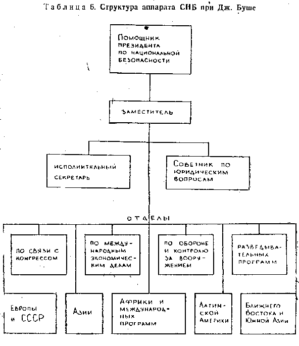 Пришедший вслед за Р. Рейганом на пост президента Дж. Буш сохранил сложившуюся при его предшественнике структуру органов СНБ, но, тем не менее, внёс много изменений. Как и Р. Рейган, он с самого начала подчёркивал ведущее положение госсекретаря в области внешней политики и вспомогательную роль помощника по национальной безопасности. Чёткое разграничение обязанностей между этими должностными лицами позволило Дж. Бушу избежать соперничества между ними. Не последнюю роль сыграл и тот факт, что оба этих чиновника – и госсекретарь Дж. Бейкер и помощник по национальной безопасности Б. Скроукрофт являются личными друзьями президента и к тому же имели опыт совместной работы в администрации Дж. Форда, когда Дж. Бейкер был министром торговли, а Б. Сроукрофт занимал ту же должность, что и при Дж. Буше. При Дж. Буше сложилась такая традиция, когда СНБ занят разработкой стратегических вопросов и координацией внешнеполитической деятельности правительства, а госсекретарь, являясь “правой рукой“ президента в международных делах, руководит повседневной дипломатической работой.1