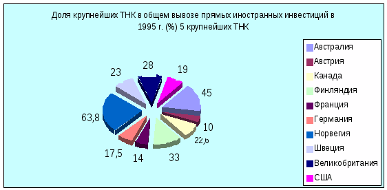Из 500 самых мощных международных компаний 85 контролируют 70% всех заграничных инвестиций. Эти 500 гигантов реализуют 80% всей произведенной электроники и химии, 95 % фармацевтики, 76% продукции машиностроения.