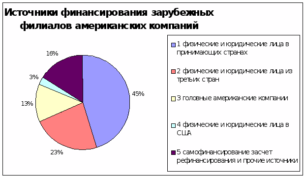 Источниками их финансирования выступают не только и не столько головные американские компании, сколько физические и юридические лица из принимающих третьих стран (см. диаграмма 3). Для этого зарубежные филиалы ТНК широко используют займы коммерческих и финансовых институтов принимающего государства и третьих стран, а не только стран базирования материнской компании;