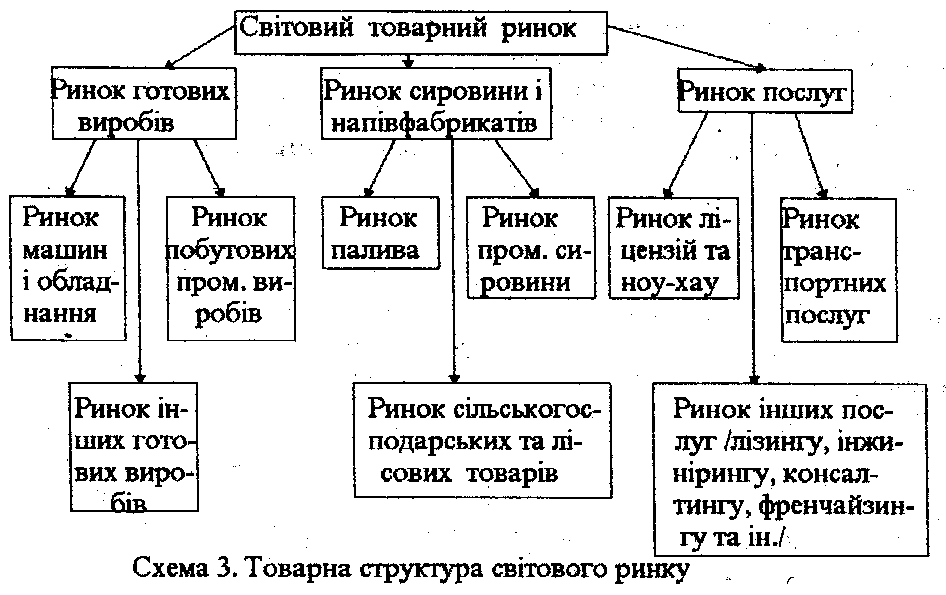За товарно-галузевою структурою світового ринку відрізняють три провідних групи товарів - готові вироби, сировину і напівфабрикати, послуги (схема 3).