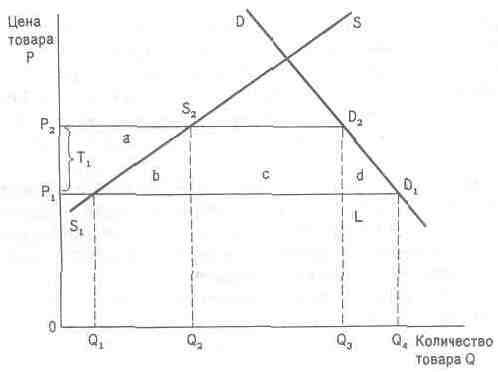 Площадь прямоугольника Р1Р2Q0Q4 будет определять величину потерь или дополнительных расходов, понесенных потребителями в связи с общим увеличением цен продаваемых товаров. Эта сумма включает дополнительные прибыли, полученные национальными производителями (четырехугольник «а»), и потери общества, возникающие в связи с тем, что в производство вовлекаются новые, менее эффективные факторы, использование которых стало возможным благодаря протекционистской политике правительства (треугольник «b»). Треугольник «d» показывает потери, возникающие в связи с уходом с рынка части иностранных производителей, а прямоугольник «с» — величину выигрыша лиц, получающих средства, собранные налогами.