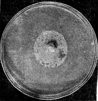Рис. 1. Синергізм у мікробів. Навколо агарового блоку з культурою актиномпцета видна зона стимуляції росту цвілевого гриба.