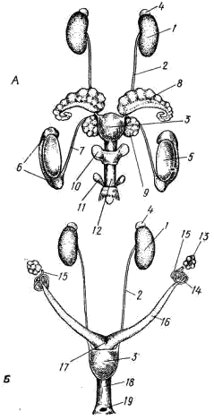 1 — почка, 2 — мочеточник, 3 — мочевой пузырь, 4 — надпочечник, 5 — семенник, 6 — придаток семенника, 7 — семяпровод, 8 — семенной пузырек, 9 — предстательная железа, 10 — куперова железа, 11 — препуциальная железа, 12 — половой член, 13 — яичник, 14 — яйцевод, 15 — воронка яйцевода, 16 — рог матки, 17 — матка, 18 — влагалище, 19 — половое отверстие