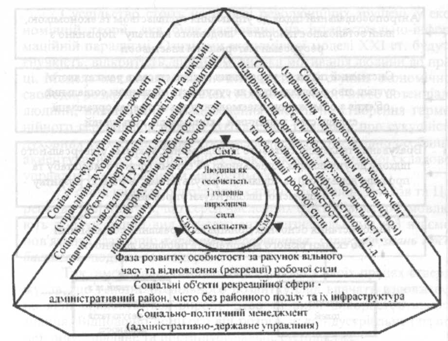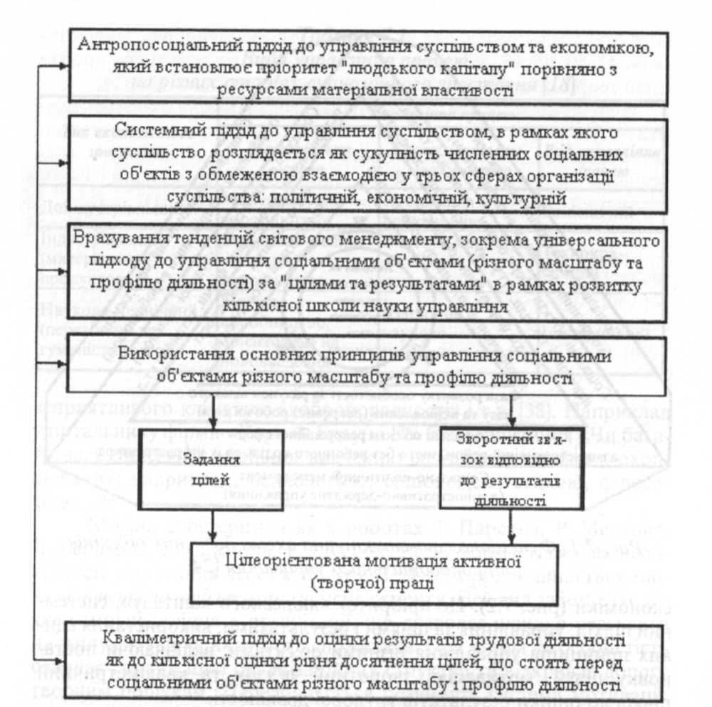 Можна спостерігати як в роботах Т. Парсона, Р. Мертона, Ч. Бернарда, Г. Саймона, Е. Голднер та ін. формується ідея необхідності управління через культуру. З 50-60-х pp. починається епоха особистісно-орієнтованого менеджменту. Цей вид забезпечує деяке самоуправління в організації, що дозволяє швидко реагувати на зміну ситуацію, на вимоги споживача. Орієнтація на особистість означає гуманізацію організаційних структур та відкриває дорогу творчим пошукам. Передбачається розвинута система мотивації, яка враховує різноманіття трудових цінностей працівників. Питання переходу від технократичного до особистісно-орієнтованого виду менеджменту розглядає Г. Дмитренко [24]. Він називає останній антропосоціальним управлінням, підкреслює необхідність охоплення ним трьох базисних об'єктів: духовного виробництва, матеріального виробництва та адміністративно-державної системи (рис. 1).